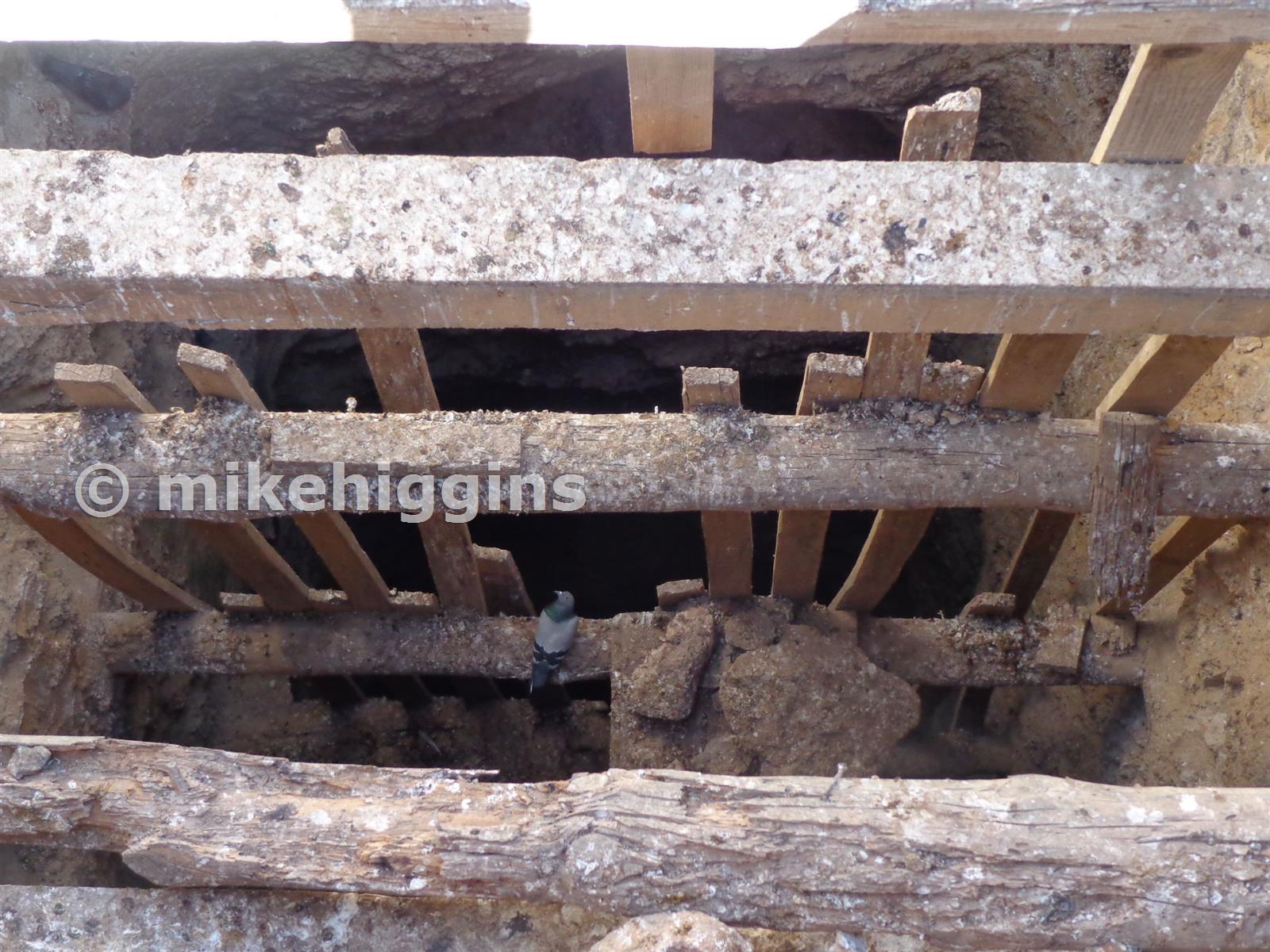 View down the shaft showing the wooden framework dividing it into two compartments.