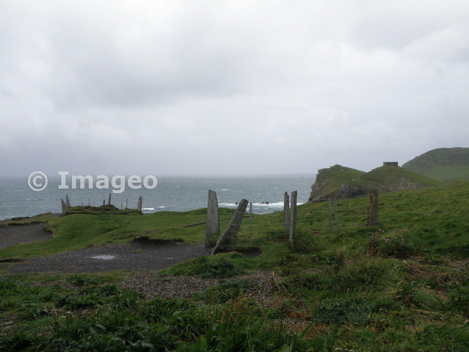 The two shafts on the clifftop near Doyden castle (in the background). The nearer shaft is mainly in killas and connects with a large sea cave at the bottom which is developed on a major north dipping fault structure. Just above the bottom of the shaft a drive heads for the other shaft but was blocked (mid-1970s) by a collapse or fill from the shaft.