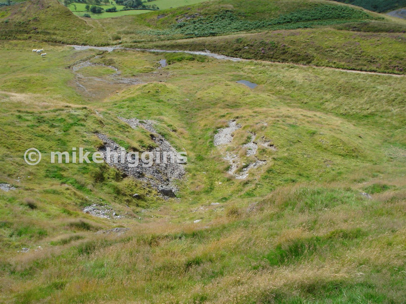 Looking down from the whim shaft on the cutting to the run-in shallow adit