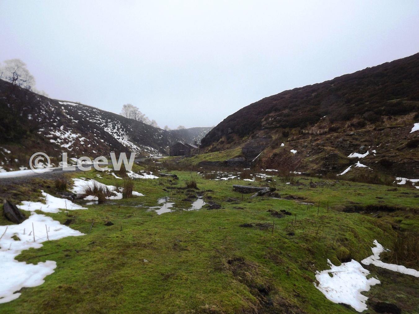 View looking up across the site of Sharnberry Low Level with dressing plant area, low level behind and the mine buildings (smithy?, managers house?) beyond