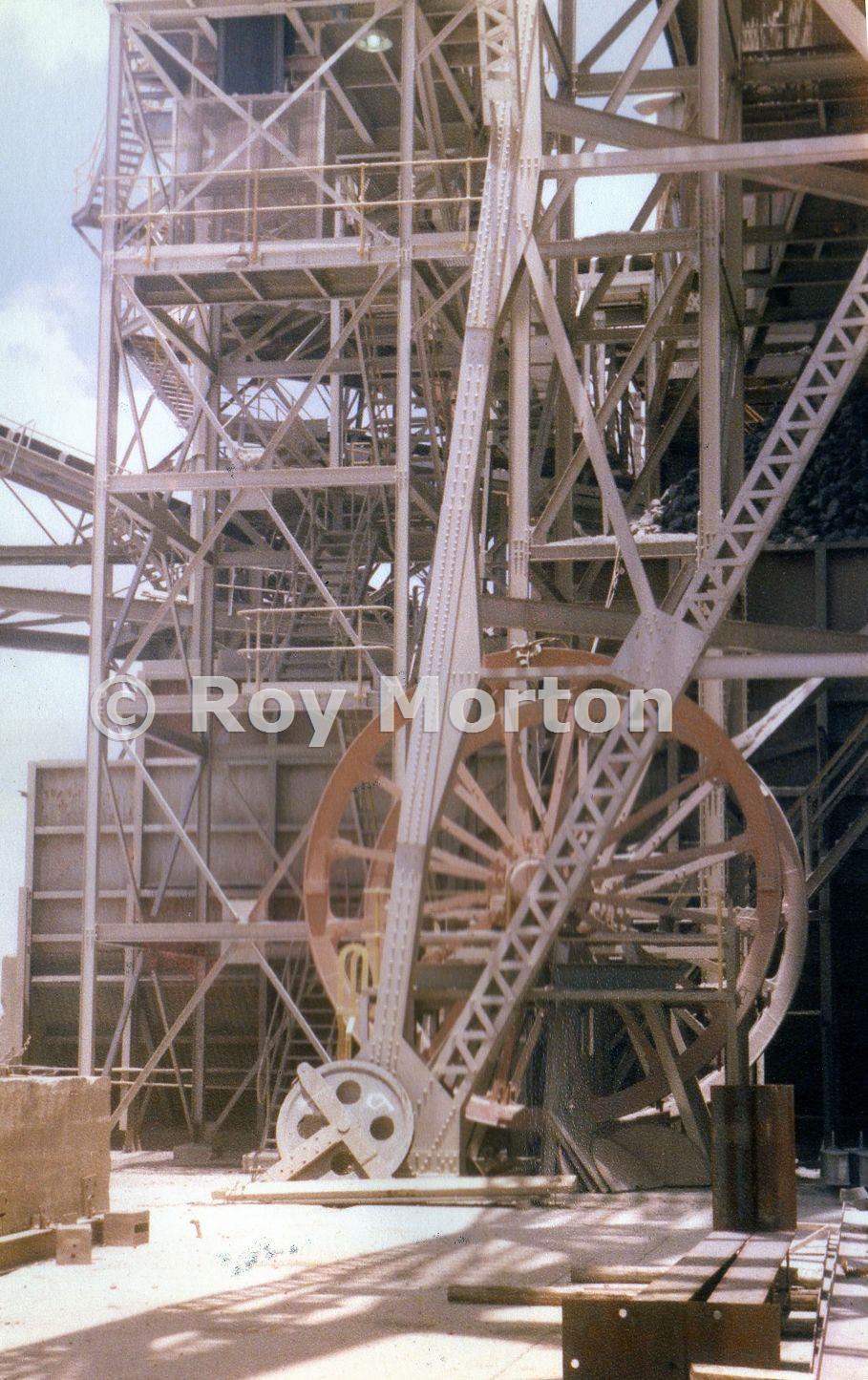 Sheave wheels at the base of the headframe. Some scale can be derived from the stairway in the background. Given that the standard spacing between steps is 9inches (228mm) it makes them enormous even allowing for perspective. The puuley too must also be pretty hefty.