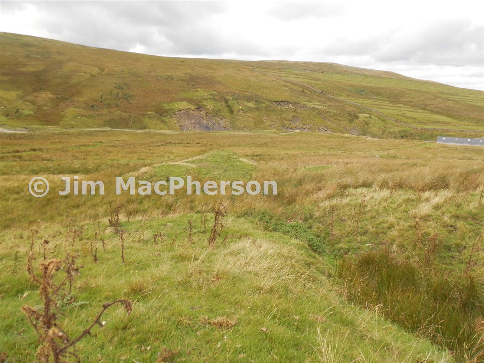 Small tips just below Shield Meadow Low level east of the line of the flue from Tynehead Smelt Mill (barn roof middle RHS). Immediately above the grey scar in the mid distance is an area of brown which is the remains of the "bog burst?" that caused the 1990''s landslip, the area has been replanted presumably to help stabilise the ground.