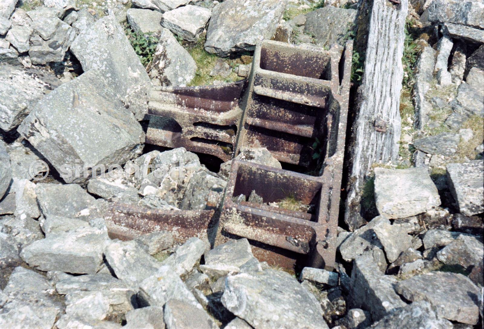 Laid amongst the debris of the engine house which had collapsed into the shaft was this bearing for the bob of the beam engine, probably Cornish. Removed about 1990.
