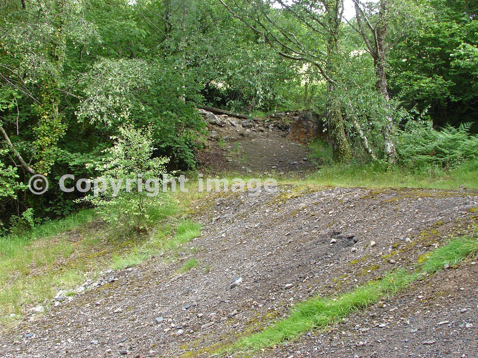 The base of the old crusher house at Silverbrook Mine. This once contained a rock crusher driven by a 20 inch steam engine installed in a house to the left of the crusher. This engine also doubled as a winding engine for the main shaft which was situated in the area of shadow by the tree trunk on the left of the photograph. The crusher was fed from above and there was a rail incline supported by large poles which the ore wagons would be pulled up, presumably by a winch at the top of the crusher house. The base of one of the poles can still be seen near the stream. The sketches of the mine by Frederick Foote, a local artist, show this incline in good detail.