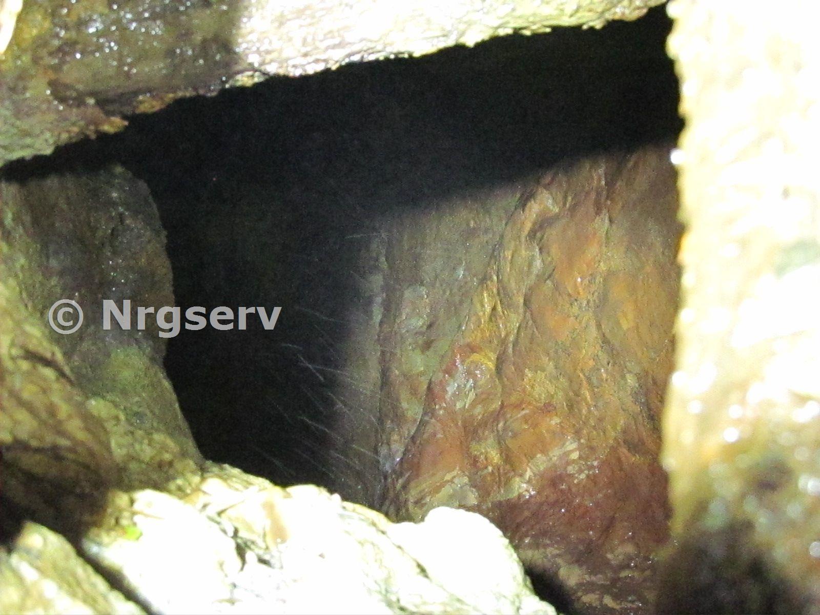 Looking down the stope through some rather dodgy false flooring, to the water level of flooded workings.