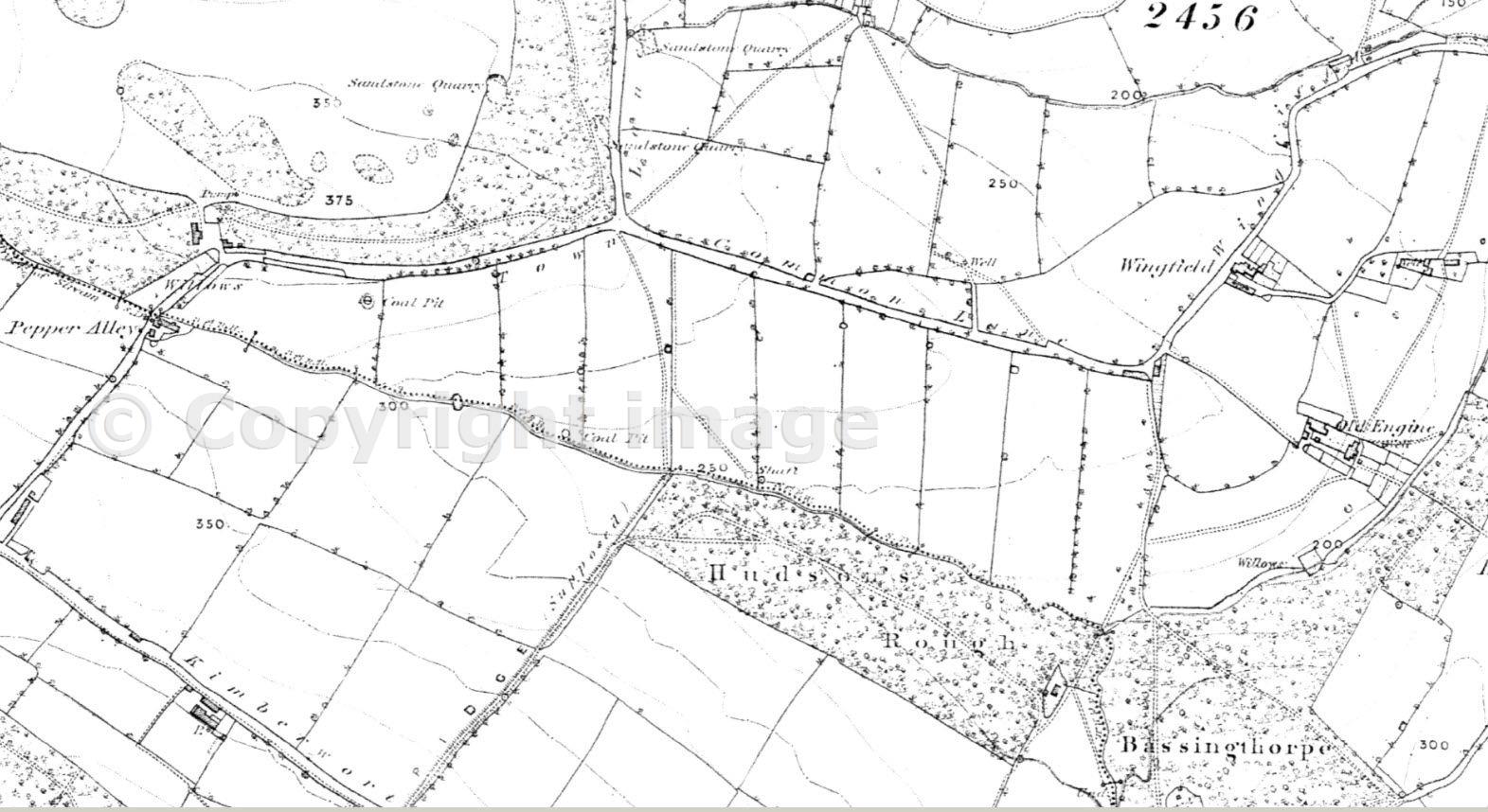 The map shows the site of Greasbrough Colliery labelled Pepper Alley where the Sellars brothers sunk pits in the early 1850s. The map also shows Old Engine to the east, and the building to the north of that is labelled Lower Engine on later maps.