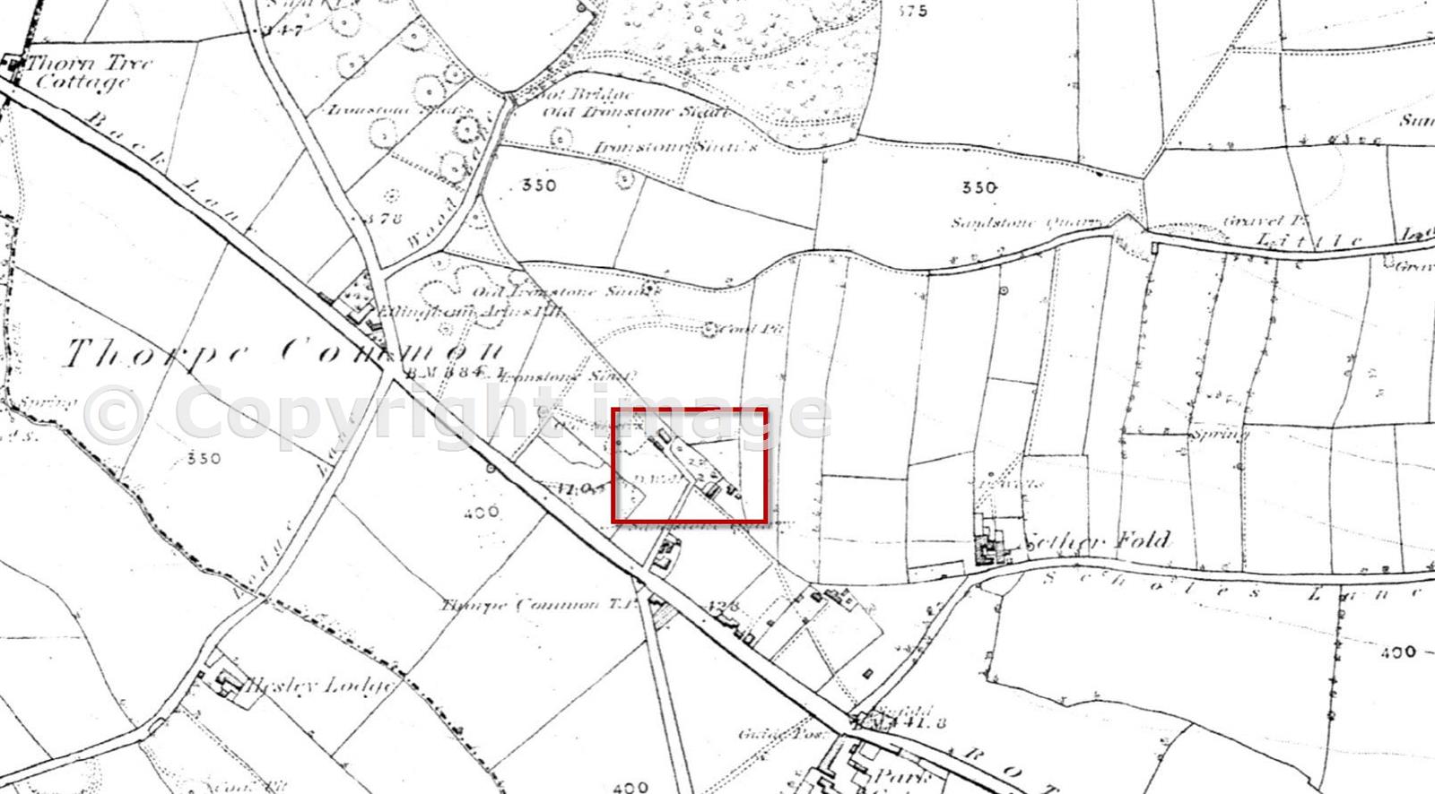 Ordnance Survey map extract from 1850 showing the site of Scholes Colliery with ironstone bell pits to the NW.