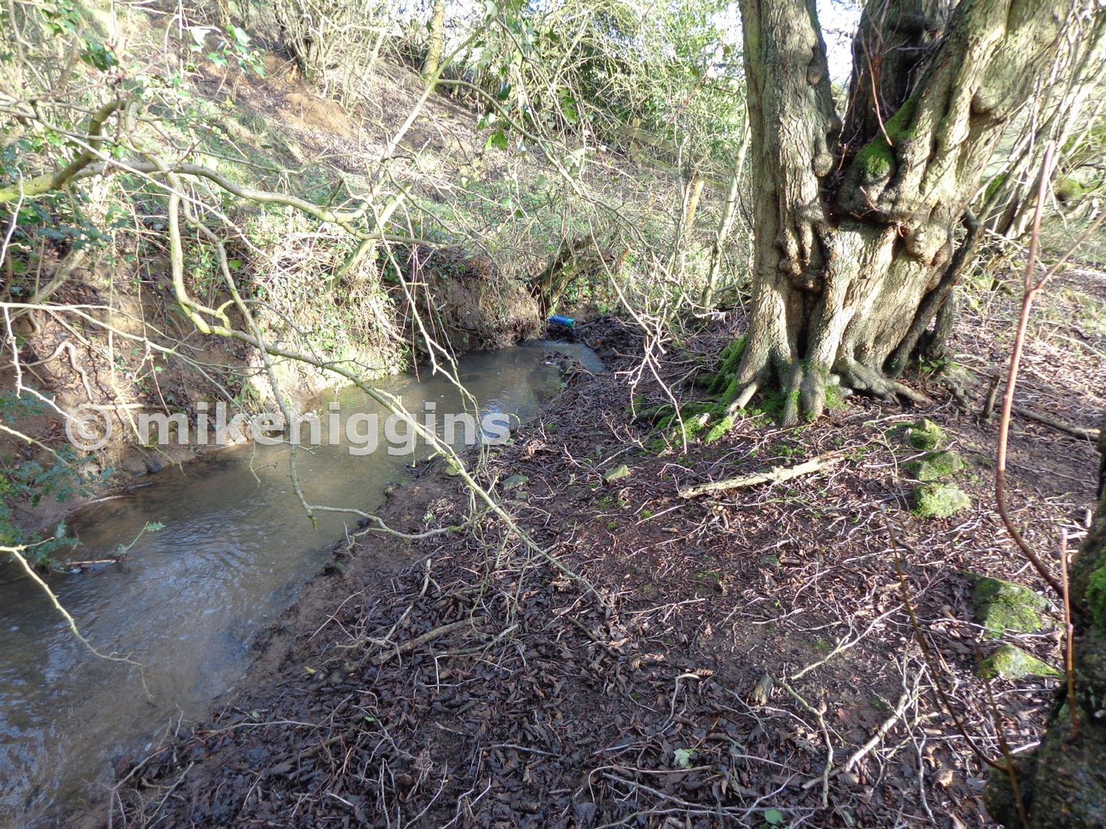 View from the west - the blue pipe protruding from the north bank of Pitty Brook marks the spot.
