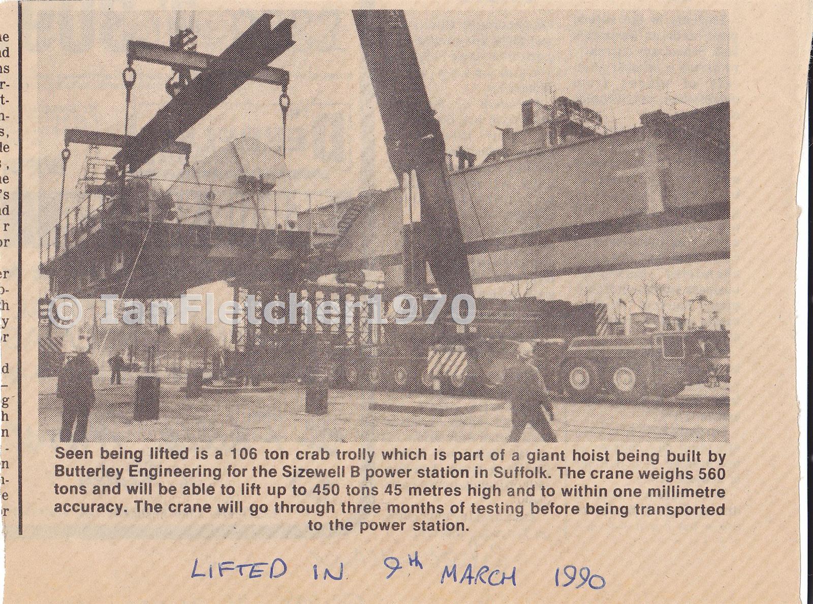 Article from Ripley & Heanor News 16th March 1990 showing Sizewell Crane Trolley being lifted onto crane outside main offices