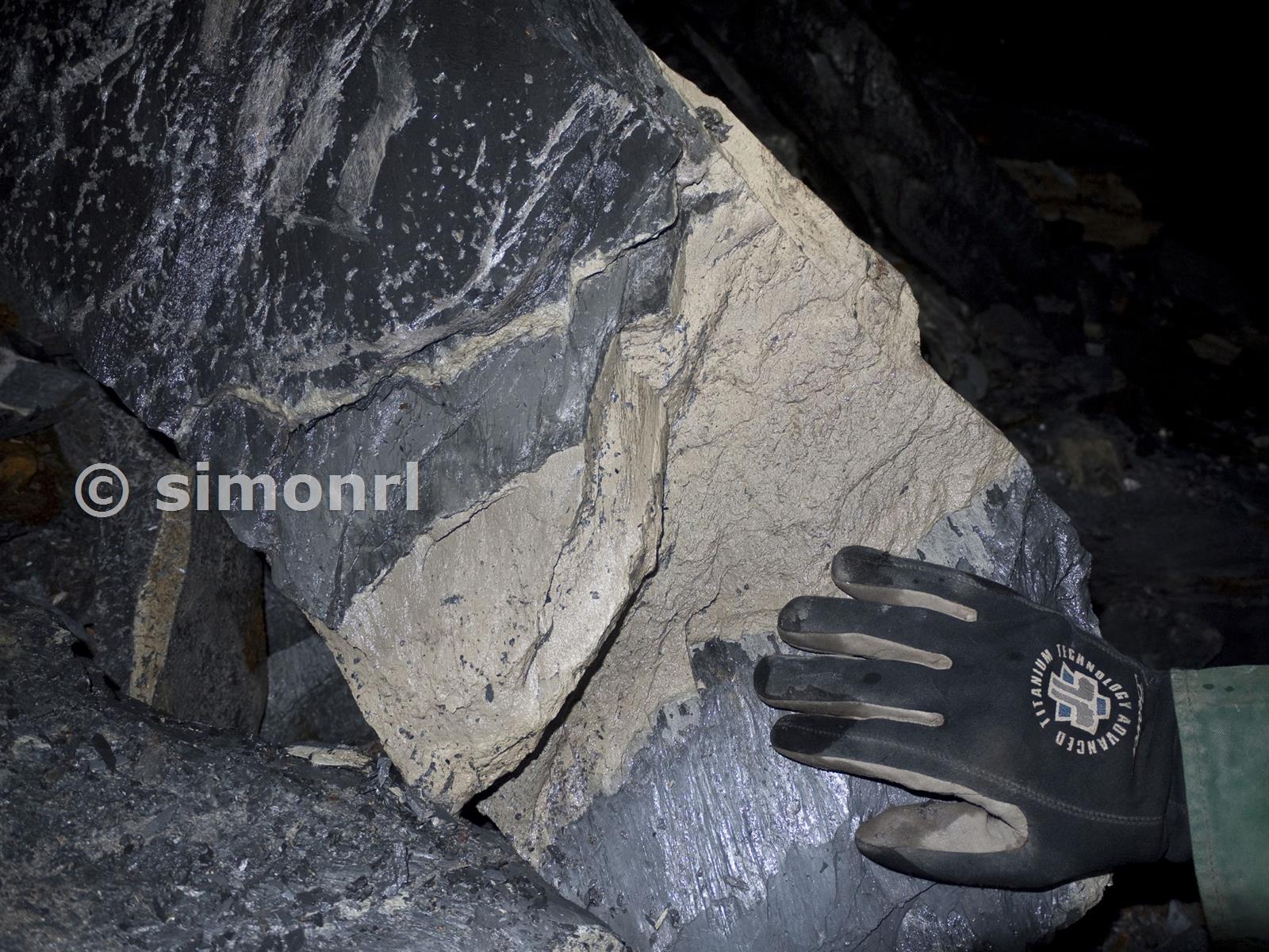 Slate block - what is the yellowy sand like band? Rhosydd Slate Mine February 2011
