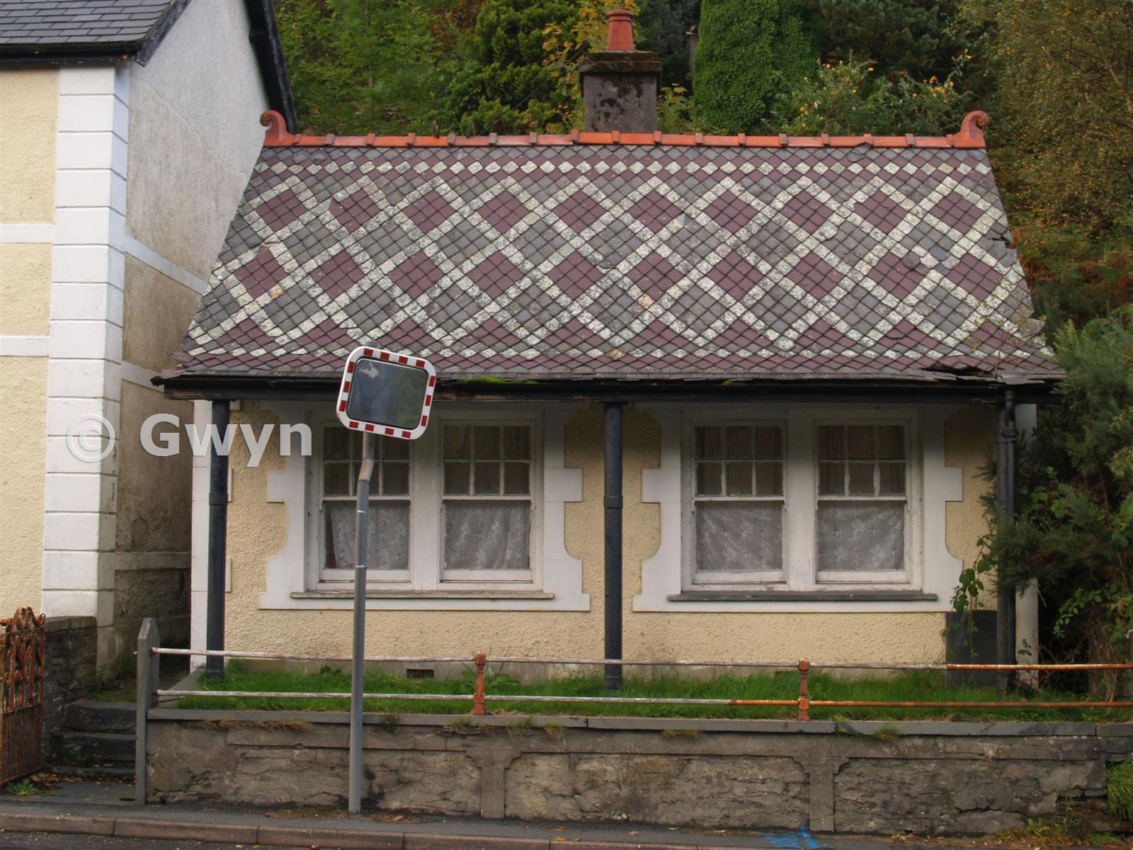 A fancy slate roof. This building is on the NE side of the A5, opposite Pont-Cyfyng, on the SW side of Capel Curig, near Bryn-glo. October, 2009.