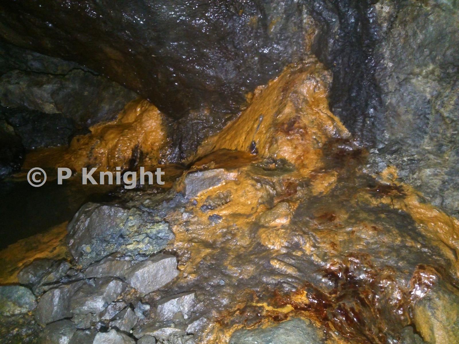 Small dam covered in formations at the end of the level, past the shaft and adjacent to the stope collapse.