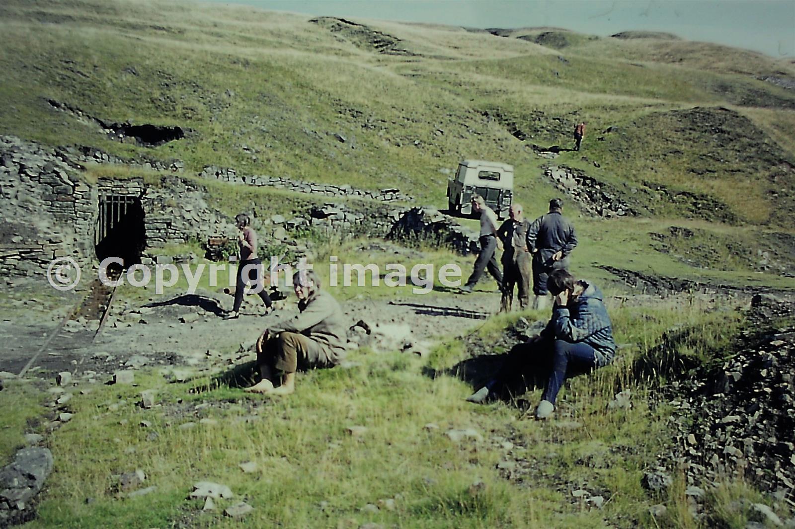 Smallcleugh adit (probably 1971/2) JFM''s photo is a bit out of focus so it''s difficult to get much detail. There is possibly a metal tub to the right of the entrance (perhaps the same as in HMP pic from 1972 in John Lawson''s album). L to R anon, Jessie Guthrie sans socks, anon shirtless man, Bob Guthrie, HMP''s back (probably) and FMM (being camera shy)