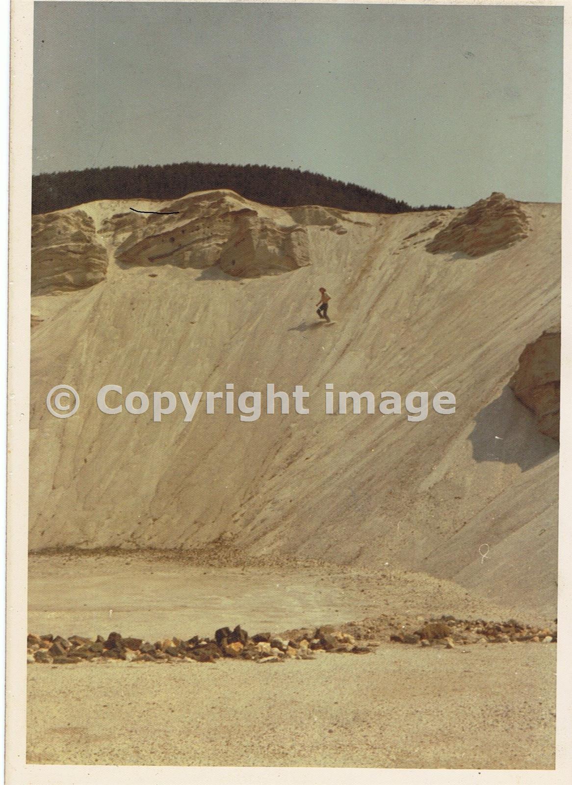 Me being fearless on the scree and showing off to wife-to-be (perhaps less wise in hindsight given how many scree runs have lost all their talus). Can''t find a pic of current state but I hope they are still intact. I think it may have been in the drought summer of 1976.