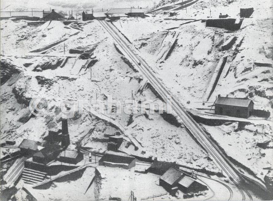 Looking into the Sinc from Bonc Siafft, with the incline from Bonc Coedan to DE Floor dominating the picture. On the way is the C floor compressor house and on DE you can see the chimney of the old G pump behind the HIK arches incline building.
