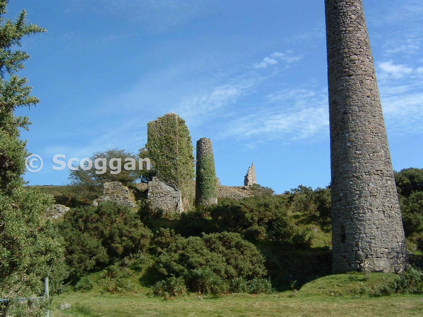 Sump shaft winding engine house, Pearces 50in pumping engine house remains on the sky line. 14-09-03