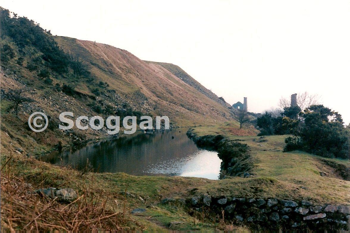 The main water reservoir known as Donkey Pond hear full of water. Jopes engine house in the distance.