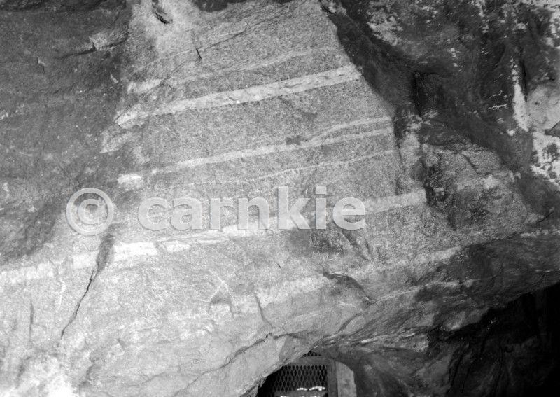South Crofty Mine, Carn Brea. South Crofty Mine: horizontal quartz veins. Horizontal quartz veins in granite country rock, exposed at the shaft station of the 290 fm. level, Robinson's Shaft. The veins, which pre-date the lodes, carry also feldspar, wolfram and more rarely fluorspar. Photo P208025. Reproduced with the permission of the British Geological Survey ©NERC. All rights Reserved.