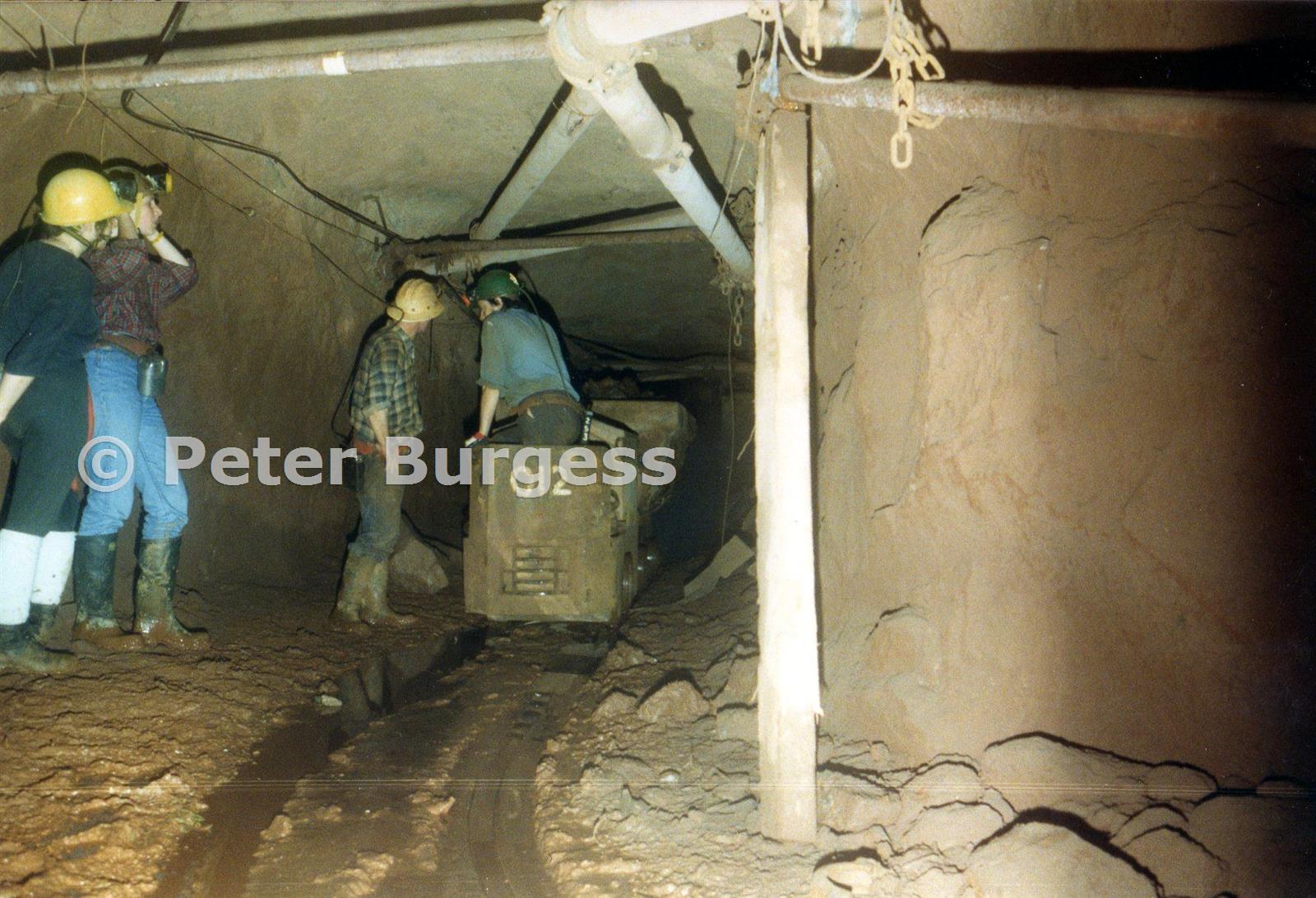 Loco approaching with train of wagons. 400 level, New Roskear section.
