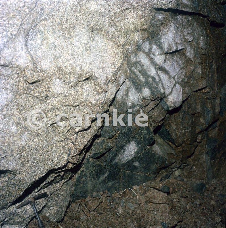 South Crofty Mine, Robinson's Section, cross cut N. from No. 4 to No. 6 lode. Megacrystic, coarse-grained, biotite-granite/elvan contact. in cross-cut. Photo P213050. Reproduced with the permission of the British Geological Survey ©NERC. All rights Reserved.