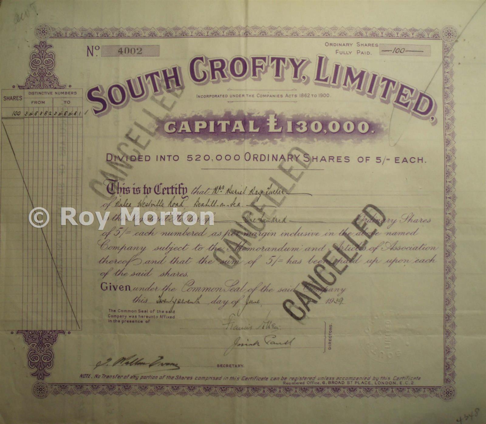 South Crofty Share Certificate, counter signed by Josiah Paull Dated 1939.