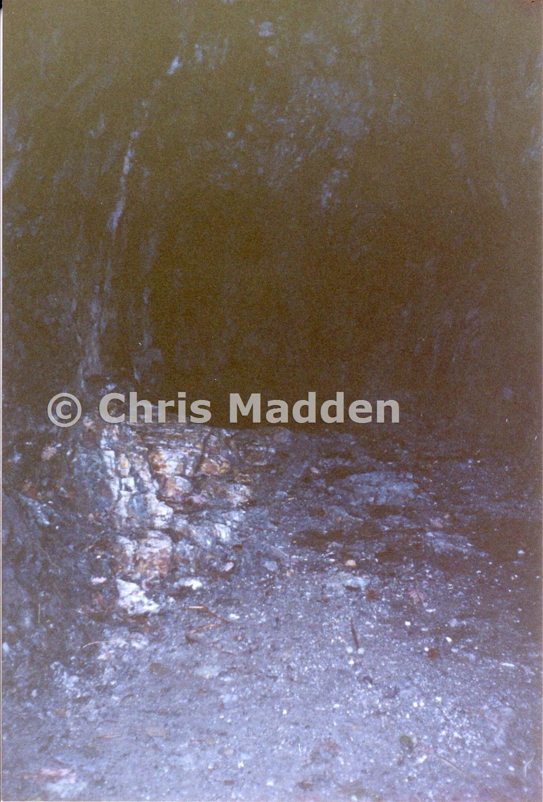 The vein is no more than a 2cm wide gouge filled fault between a diorite sill until it forks and swells into two veins 1.8m.