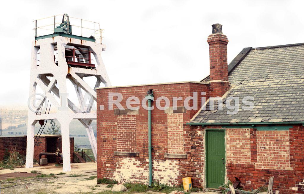 View from the road entrance of the Southern concrete headframe and Ventilation Fan House (right), 6th May 1984. (Scanned from a damaged slide, image restored as much as possible in Photoshop).