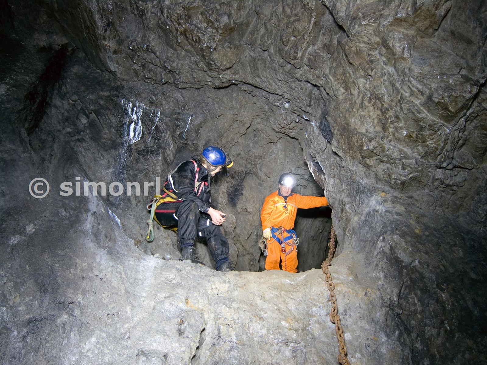 Sparty_lea and Timberman in a small blind-ending passageway off the deep adit level, Bwlchglas Lead Mine. 15/05/2009