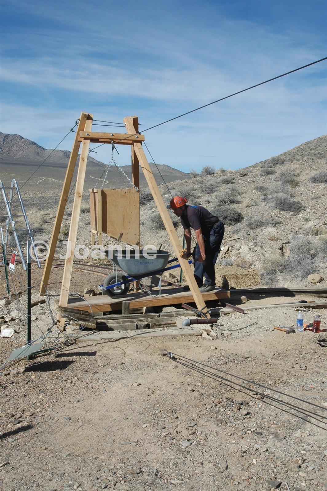 We''ve hauled up a load of dirt from the bottom of the shaft. Two wheelbarrow trips to unload the bucket, then back down for more.