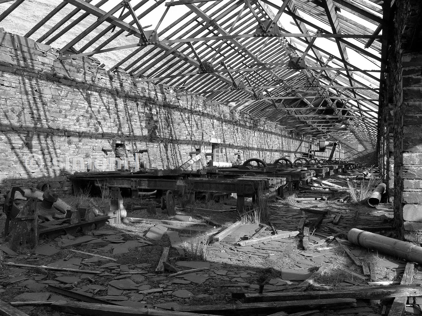 A row of saw tables, most still largely intact. Ventilation was a late addition to these tables, and the reward for many of the men who worked them an early death from silicosis.