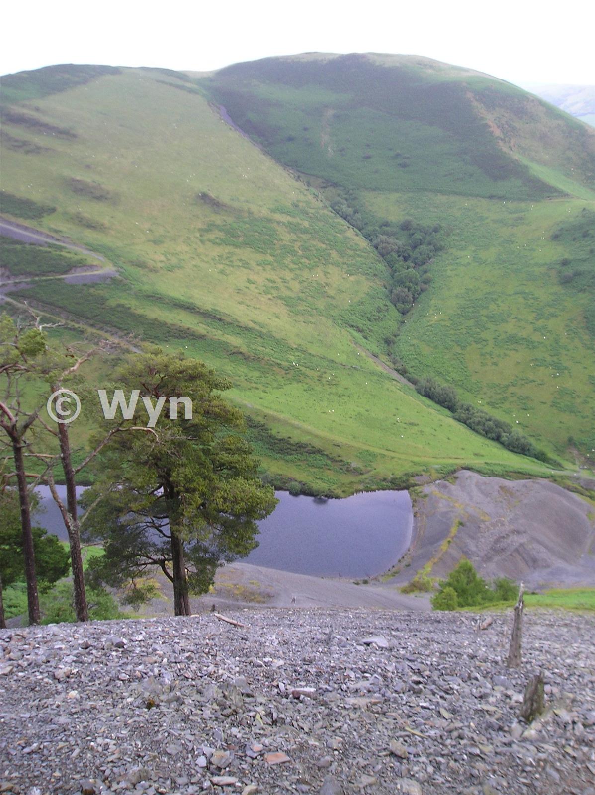 View down from shallow adit area to reservoir in valley. The deep adit was at this level, but has been buried.