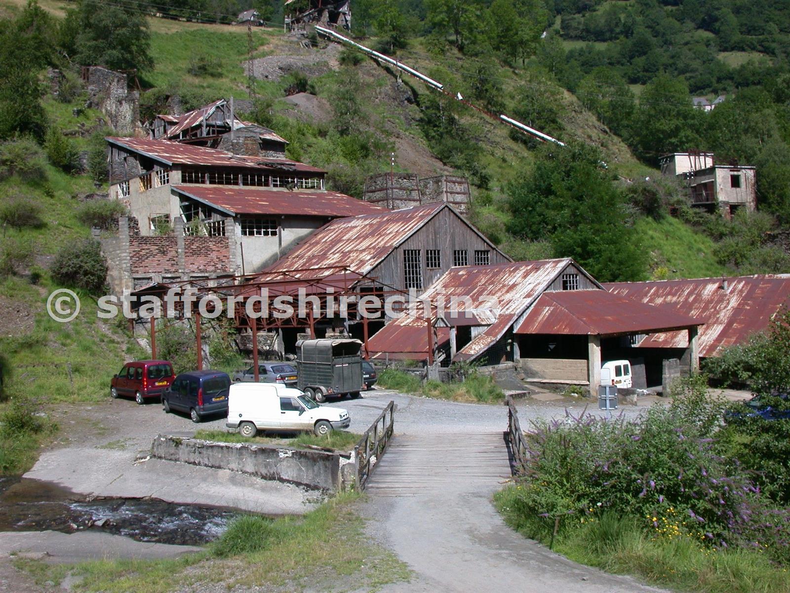 This is where you leave the car. The track starts behind the camera. The sign at the bridge says no unauthorised vehicles and there is a locked barrier. The track is used by shepherds and EDF workers for the hydro electric plant. The complete mill is here too with cableway feed at top centre.