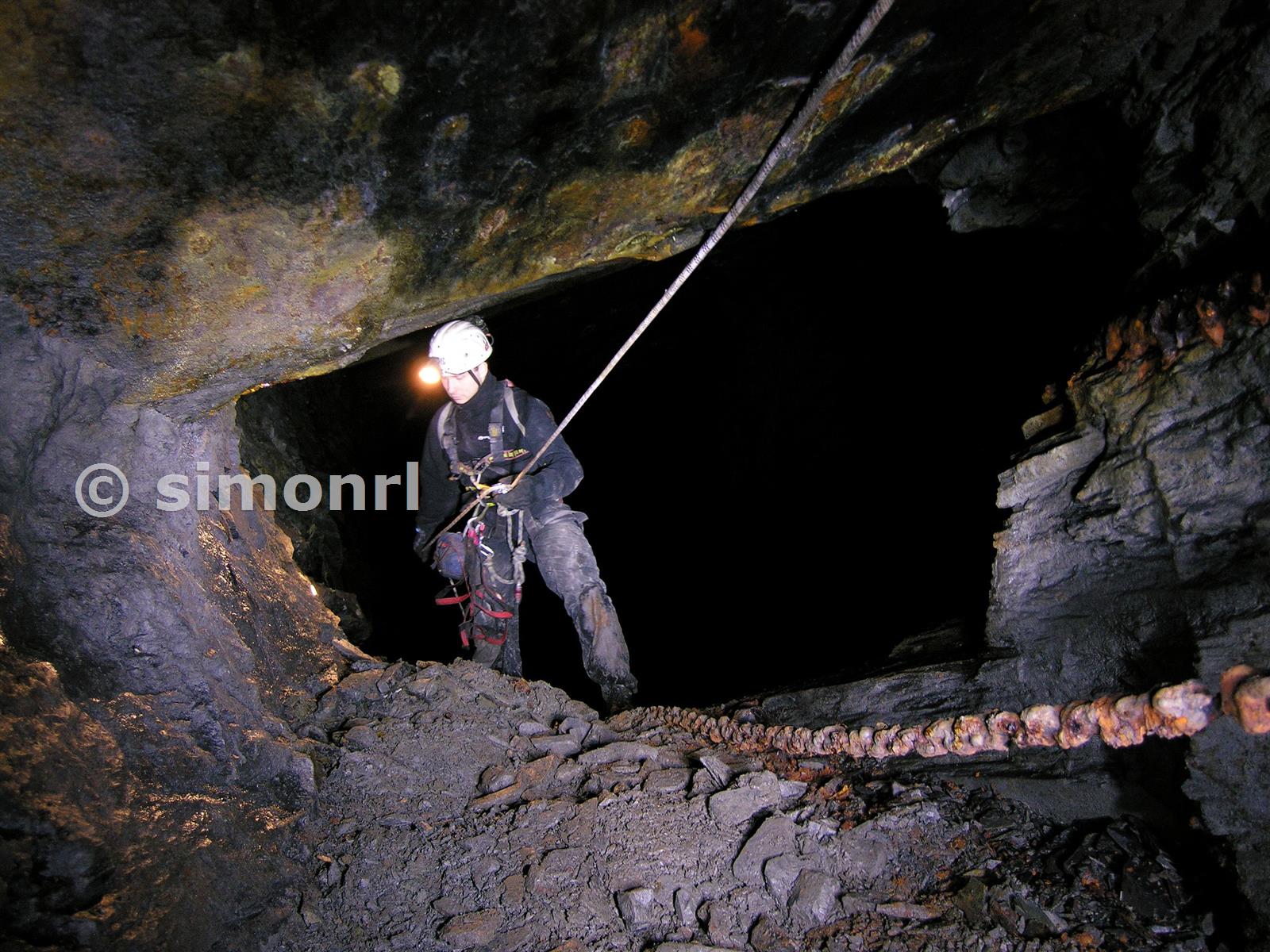Fuzz becomes (that we know of) the first person to enter these chambers on floors C and D in the Cwmorthin back vein since 1902. The descent started at the end of a manway leading down from lake level (floor 1) which had previously bolted.