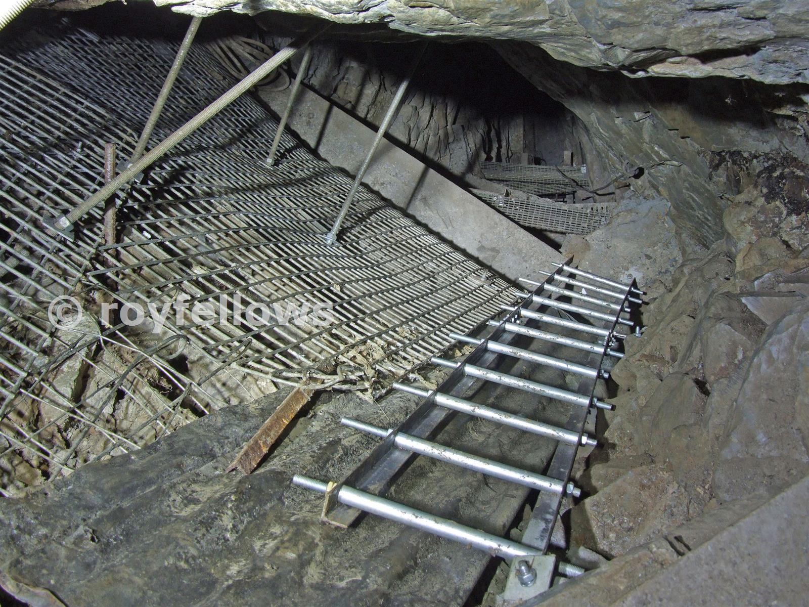 "A dry, dusty old place" as one of the original digging team described it, should have realised the potential for dry rot. 12 months on from the concreting, all was well bar the wooden ladders. A pre-treated one was perfect, another was falling to pieces. It was decided to strip out the two central ladders and replace with galvanised steel honeycomb steps, concrete steps, and steel ladders. Pre-fabricated they assembled easily underground. Note the fixing brackets, they are top, bottom, and central.