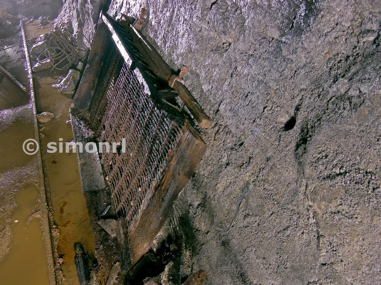 A rule for measuring stemples, 40 yard level, on top of a large sieve for sorting and grading ore. Snailbeach Lead Mine 06/06/2009