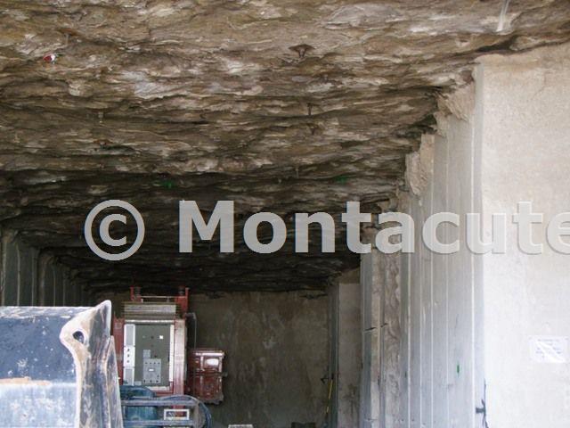 This is detail of one of the development mines used to develop the new skill of mining Portland stone on the Isle of Portland. Roof defined by strata of diffeent heavily fossil loaded stone.