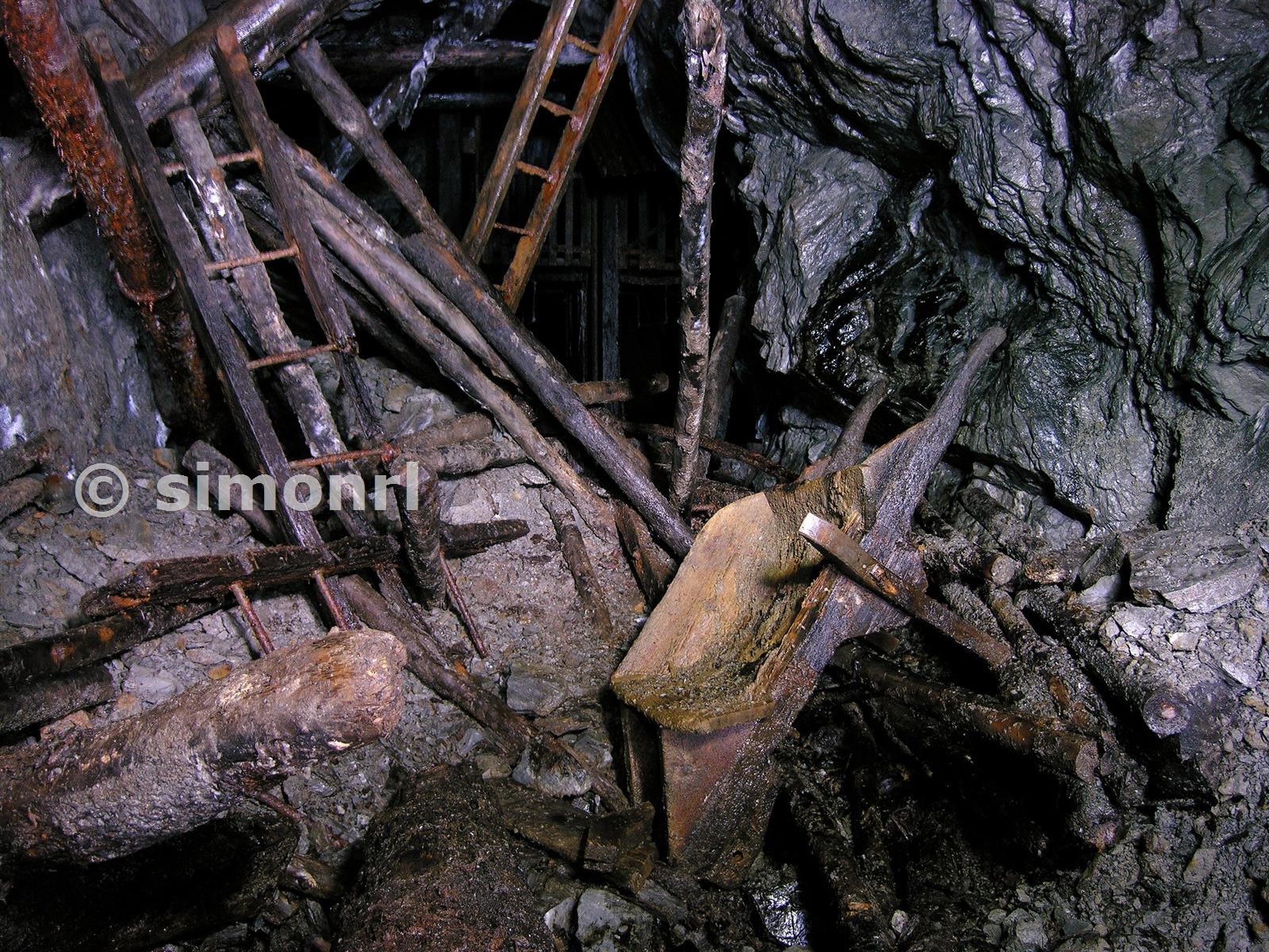 At the bottom of the deep level adit stope are the remains of manway ladders, props and a wooden wheel barrow.