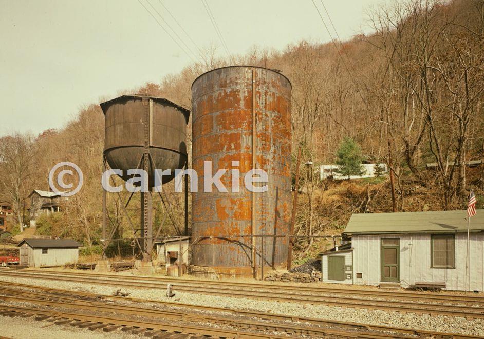 SOUTH ELEVATION OF ELEVATED STORAGE TANK AND STANDPIPE, WITH PART OF POST OFFICE AT RIGHT. Courtesy Library of Congress, Prints & Photographs Division, HAER, Reproduction number HAER WVA,10-THUR,1-34
