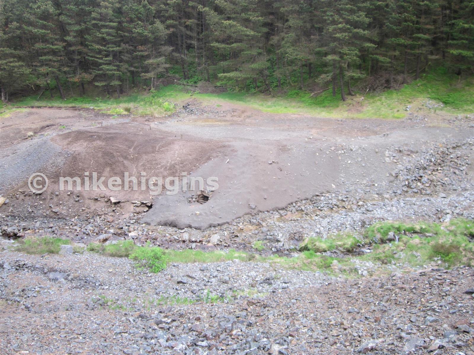 View of the fine tailings from the north side of Nant y Cagl showing what appears to be a culvert taking the outflow from the lower wheelpit (now redundant - the water now exits down the channel on the right of the photo).