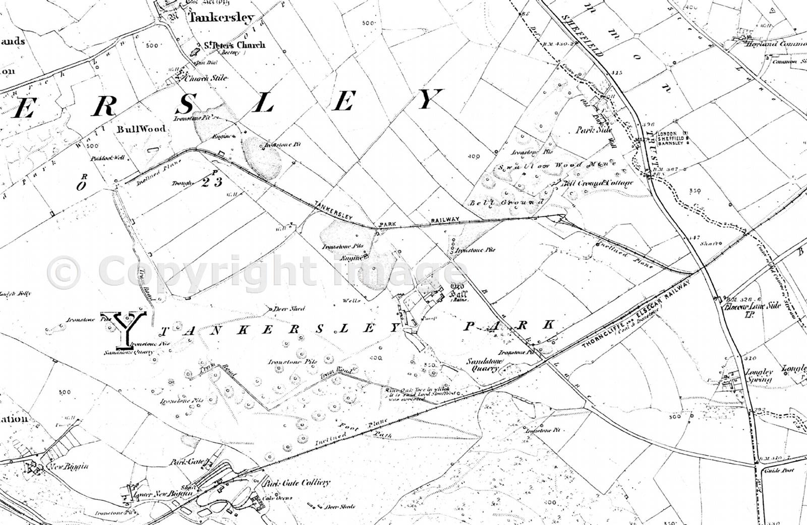 Ordnance survey map extract showing the extensive and systematic working of ironstone by bell pits in Tankersley Park.