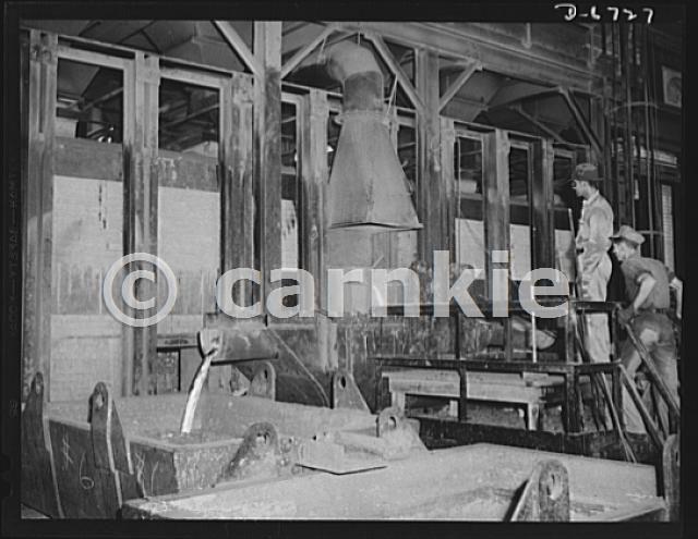Tapping the furnace of a Southern tin smelter in which pure tin is extracted from the raw ore of South American mines. Here tin is drawn off into floats which weigh about eighteen tons when filled. The metal is then conveyed to polling kettles, where dross or skimmings are drawn off and forwarded to another furnace for re-melting Courtesy Library of Congress, Prints & Photographs Division, FSA/OWI Collection, reproduction number, LC-USE6-D-006727.