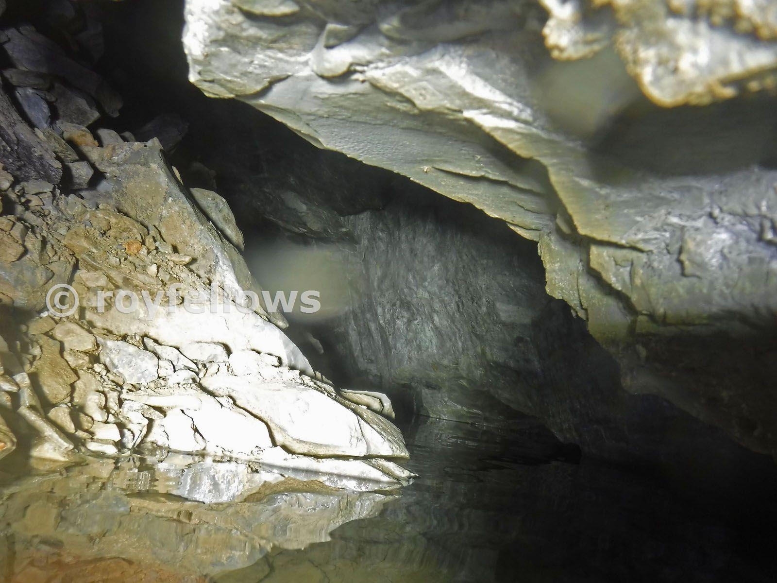 Taken around a corner using rubber arm techniques, it wasn''t expected that this picture would be any good, but apart from the water droplet it gives a good impression of the state of the level. The thing that looks like a massive cross stemple behind the water droplet on the lens is actually a massive fallen slab which holds back loads of rubble that has come down the stope. I feel that this is fair indication of the rest of the level. The incline must have carried on down straight ahead following the dip of the lode, this is now filled with rubble. The photo is also interesting in that it exactly duplicates a sketch by divers who entered the level in normal water height conditions.