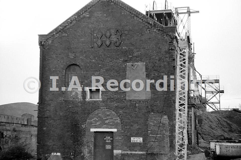 The Platt winding house (reputed to be the oldest surviving structure on site) constructed 1883 with the emergency winder pad in the foreground - note the windows for the ropes to pass through the engine house from the emergency winder to the sheaves. (August 8th, 1978)