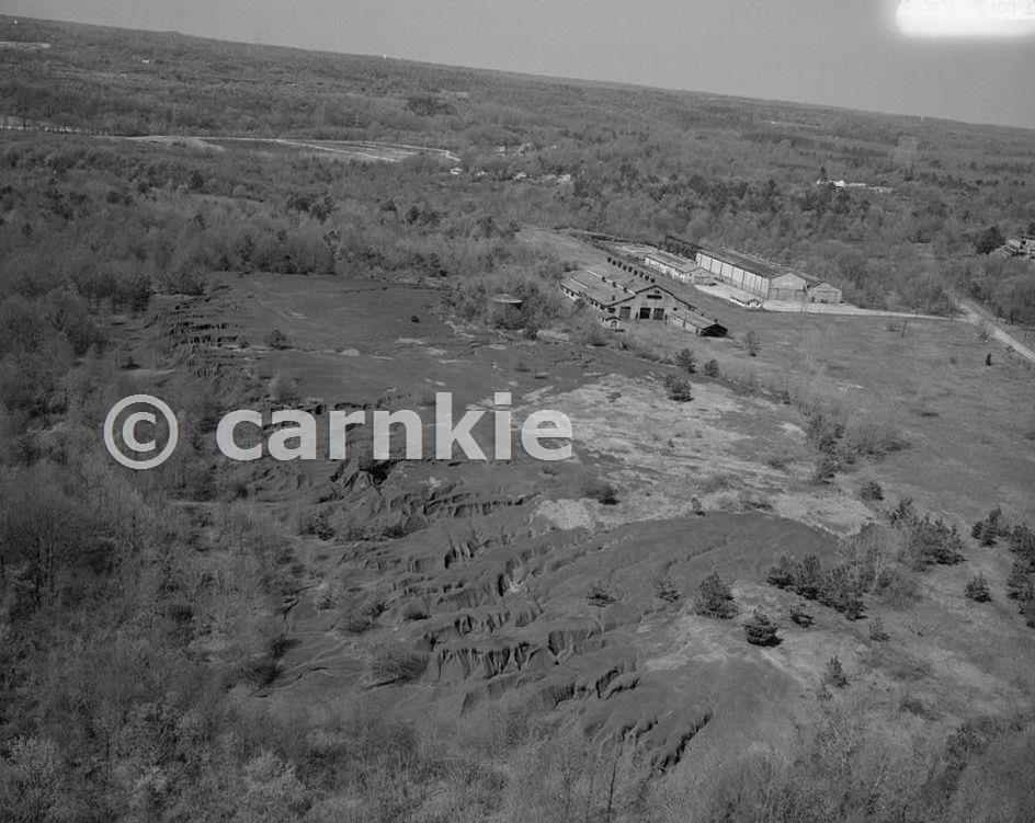 . AERIAL OVERVIEW, LOOKING WEST, WITH BEE HIVE COKE OVENS IN FORESTED OVERGROWTH (BOTTOM LEFT), COKE TAILINGS PILE (BOTTOM RIGHT THROUGH CENTER TOP LEFT), FORMER BIRMINGHAM SOUTHERN RAILWAY SHOPS BUILDING (TOP RIGHT). CONVICT CEMETERY IS JUST WEST OF THE TAILINGS PILE (TOP LEFT IN THIS PHOTOGRAPH). Courtesy Library of Congress, Prints & Photographs Division, HAER Reproduction number HAER ALA,37-BIRM,38C-1
