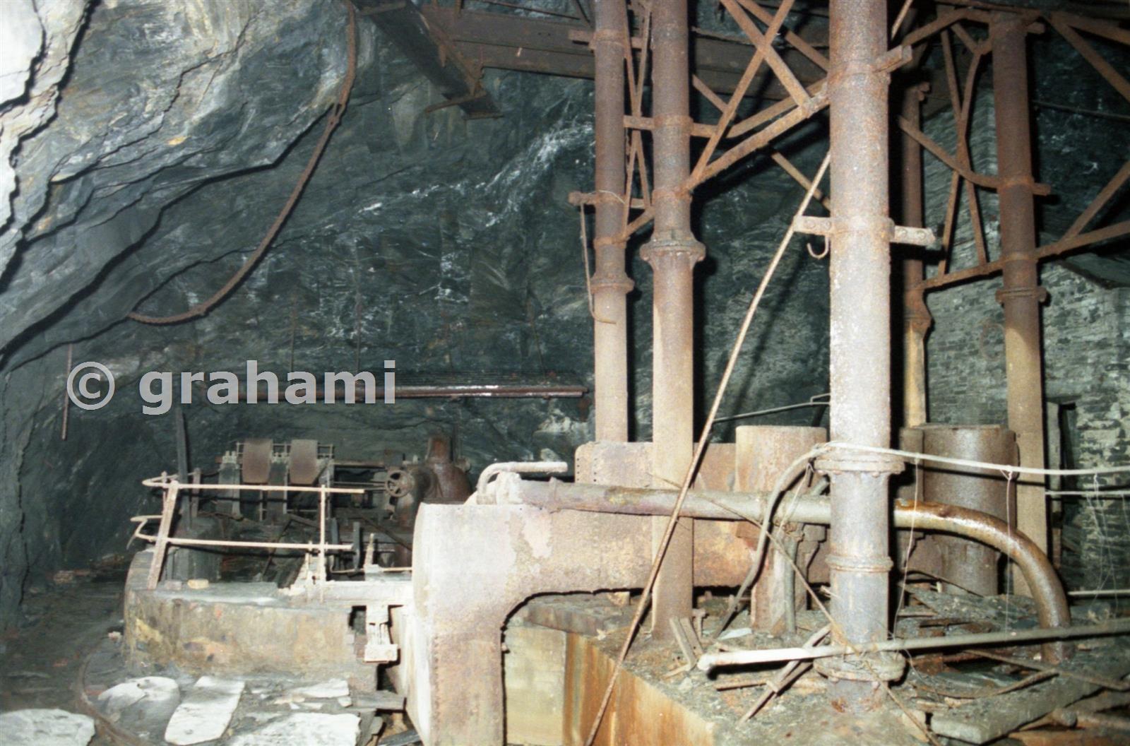 A view southward in the G Pump chamber ("Pwmp Mawr") with the pump shaft from L floor, with the discharge in the foreground and the remains of the drive etc. from the turbine beyond it and Lefal Dwr continuing in the distance.