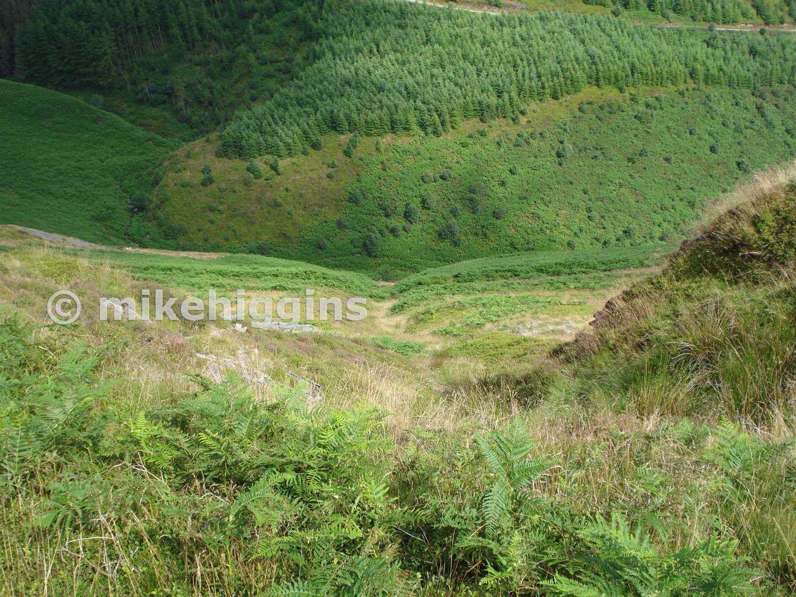Looking down the hush gutter. The tip from the Llettymarallt Adit can just be seen on the far left.