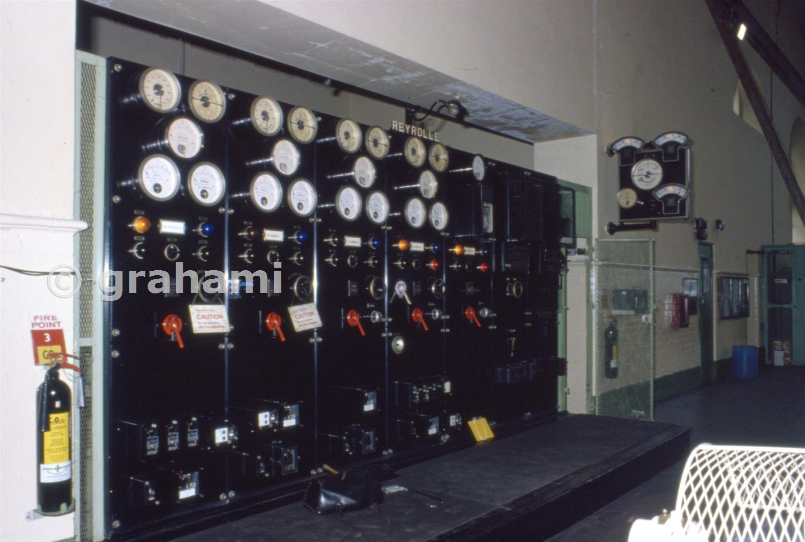 The one jutting out from the wall at right angles is the synchronising panel, used when connecting a generator to the grid.