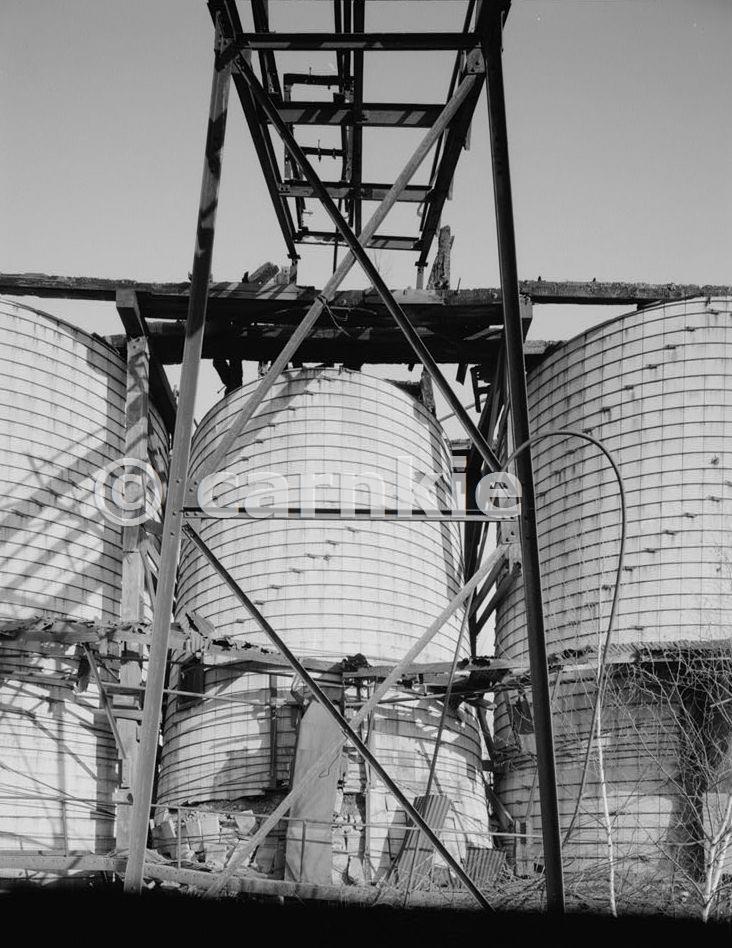 VIEW OF WEST FACADE OF MIDDLE SILO WITH PORTION OF SUPPORT STRUCTURE OF OVERHEAD CONVEYOR, LOOKIN EAST FROM BENEATH OVERHEAD CONVEYOR. Courtesy Library of Congress, Prints & Photographs Division, HAER Reproduction number HAER PA,35-SCRAN,6D-4
