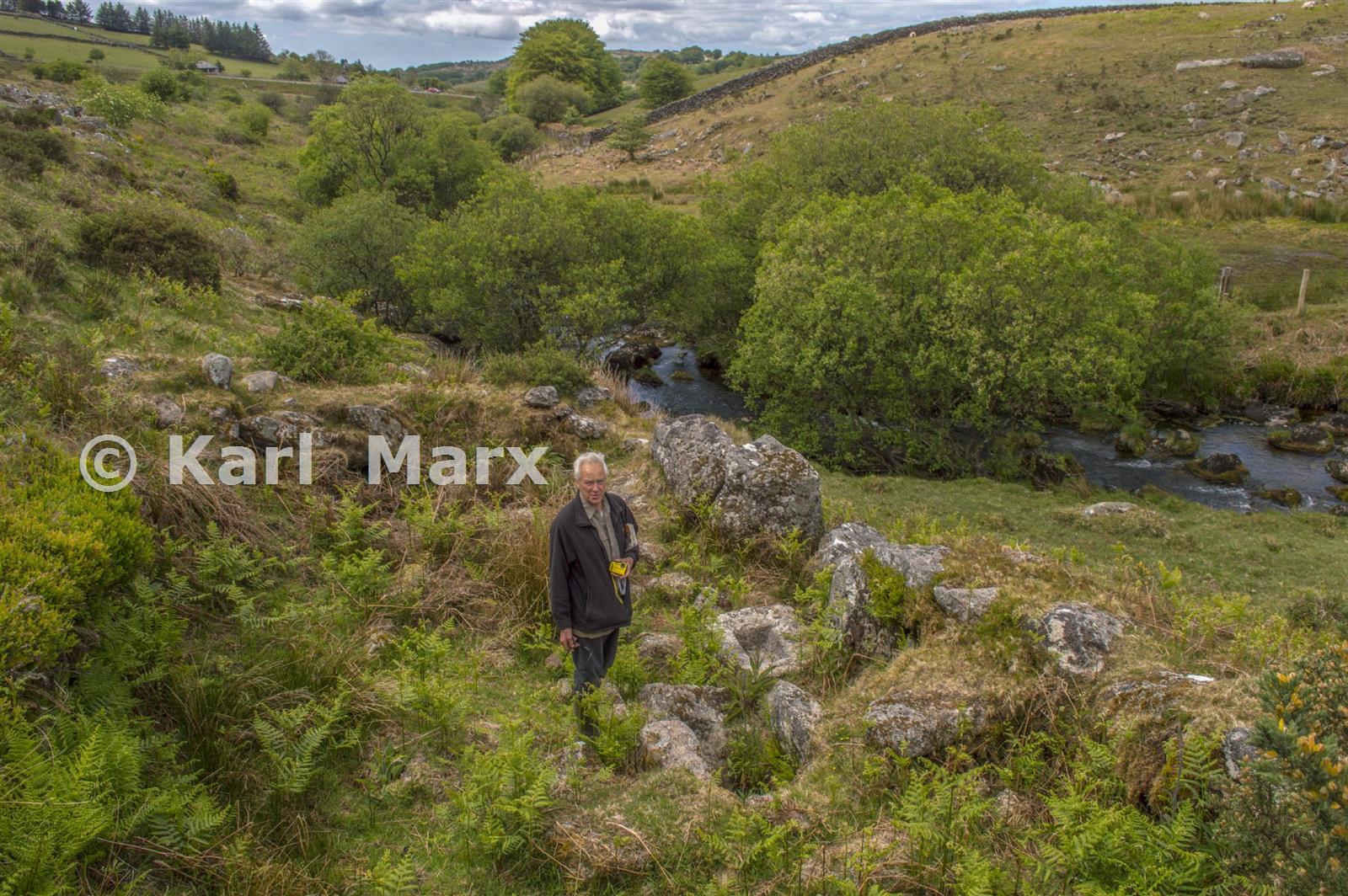 Overview of the site in its valley context adjacent the River Walkham. Note the Hearth and Mould Stone infront of and adjacent to father.