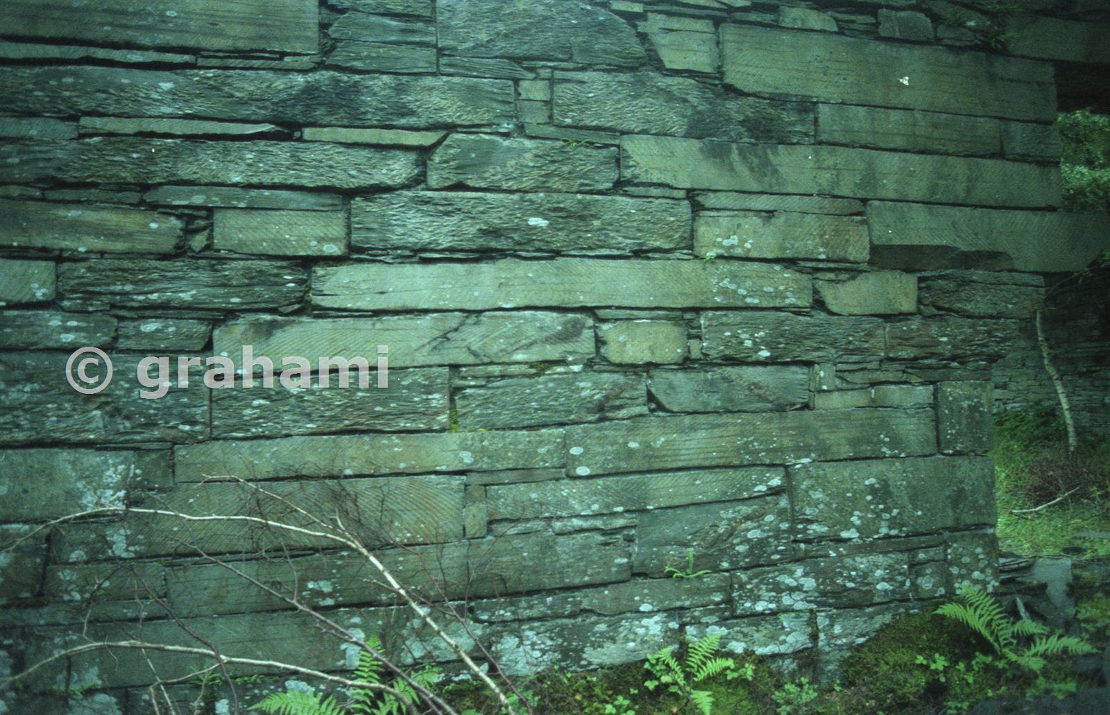 A section of the 'new' mill wall showing both rough hewn and Hunter saw cut slabs.